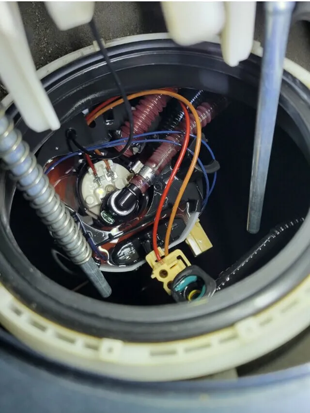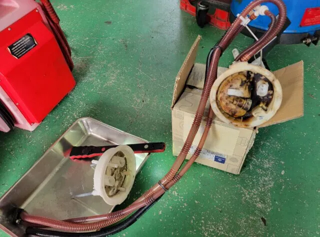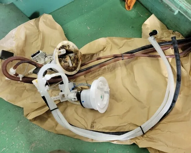 フューエルフィルターユニットがかなり摩耗ヒビ割れをおこし、ガソリンがフィルター上部に溜まった状態でした。
