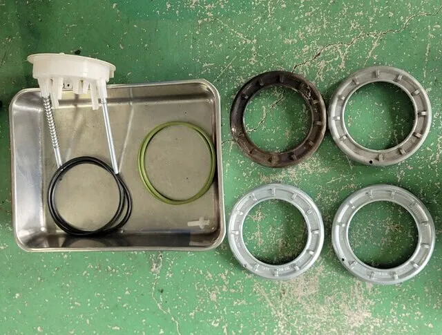 交換にはフューエルポンプの取り外しが必要になりますので少しお時間を頂き、併せて左右のロックリング・ラバーシールも交換にて作業完了✅です。