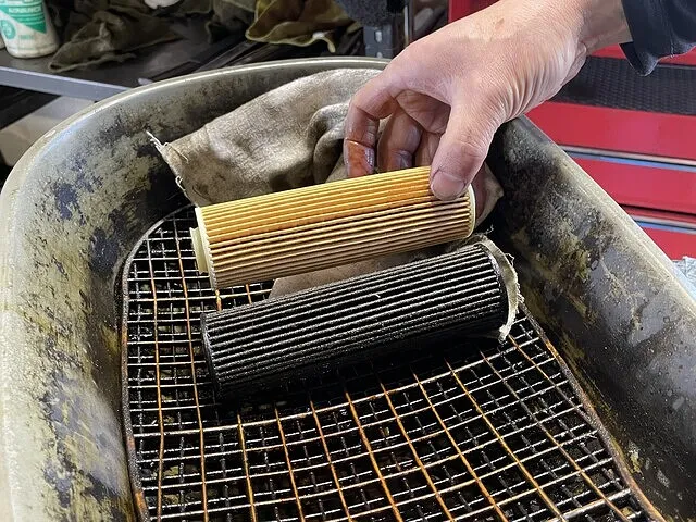 ベンツは直角にボンネットが開くので整備しやすいですね。まもなくオイルフィルターが入荷しますのでもう少しお待ちください。