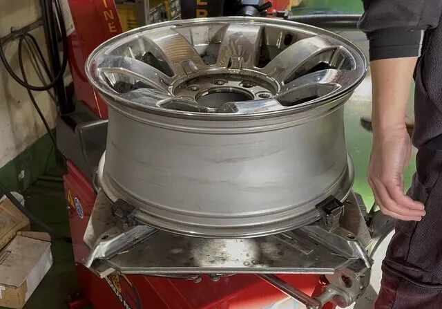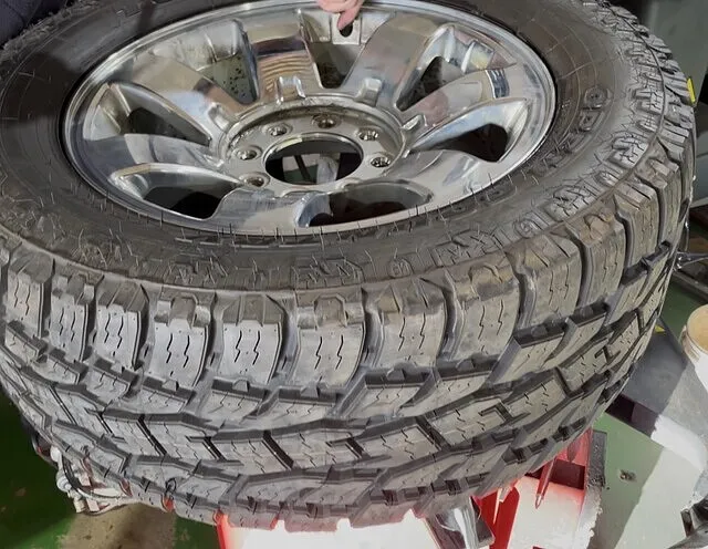なぜかサイズの違うタイヤが装着されていた背面スペアタイヤ。外径が異なりますので応急で使用した場合、即デフの故障につながり危険です。